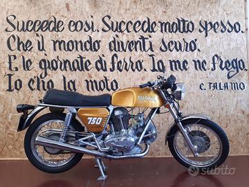 Ducati 750 GT,immatricolata 05/1972,colore giallo oro metalflake. moto completamente restaurata,300 km dal restauro. modifiche motore ,cam, pistoni,bielle e carburatori Dell'Orto come modello Sport. accensione 180w. si forniscono parti motore originali e carburatori Amal. moto iscritta Asi,senza documenti con targa.