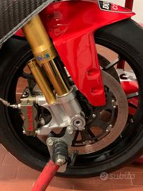 Forcella ohlins pressurizzata FG 570, mono ohlins ttx 36, sterzo ohlins, semi manubri roby moto, pedane bonamici, pompa frizione e freni brembo 19x18/20 , pinze freno brembo p6 con pistoncini 36/32 in titanio, dischi freno anteriori brembo flottanti autoventilati 305x8 e altra coppia 290x8.