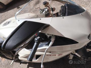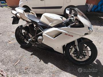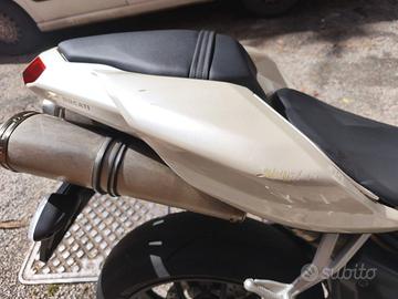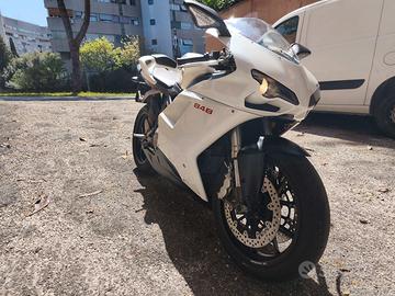 Ducati 848 bianco perla, 34500km. Motore perfetto, carrozzeria danneggiata per una caduta da fermo (fatta cadere da auto in manovra): aletta del cupolino rotta, graffio sul codone e sul serbatoio. Gomme e trasmissione finale da cambiare. Manutenzione (documentata) sempre effettuata da Lenci - Roma. Sostituito il regolatore di tensione.