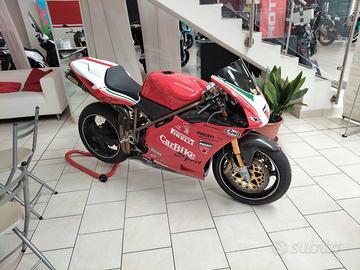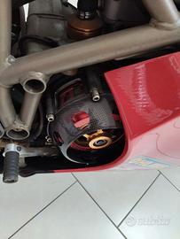 Ducati 916 ancora con targa e libretto,nata come 916 biposto, eseguita profonda trasformazione in RS, cilindrata portata a 955 con kit ducati performance,teste ducati corse con valvole 29/33 ,bielle pankl in acciaio per migliorare affidabilità,bilanciatura e alleggerimento albero motore, alleggerimento tutti ingranaggi, frizione antisaltellamento STM evoluzione, pompe freno e frizione radiali, airbox modificato evr in carbonio con corpi farfallati di derivazione 996 a doppio iniettore dentro airbox,cornetti aspirazione in carbonio telaietto anteriore carbonio, con strumentazione digitale con cover carbonio aviacompositi come tutto il carbonio sulla moto, condotti aspirazione SBK, filtri aria racing BMC a baionetta interni airbox pedane ducati performance,piastre sterzo superiore e inferiore magnesio, forcella ohlins come il mono e ammortizzatore di sterzo ,cerchi magnesio marvic penta, radiatore acqua olio maggiorato.cammes 916 sps evo pulegge e rocchetti distribuzione ergal volano in ergal.A suo tempo la trasformazione costo ?30000. La moto è ferma in salone da qualche anno necessita di un bel tagliando che è incluso nel prezzo dopo la trasformazione usata in pista 5 volte per eventi Ducati wdw ecc.Se si vogliono tutto il resto dei ricambi cilindri e pistoni ,cammes,teste,alternatore racing carene strada più altre 3 carene ,albero motore 996 RS nuovo,tubazioni acqua in silicone nuove blu , 2 coppie di bielle tra cui una coppia pankl in titanio usate, frizione originale volano standard 3 cerchi originali altri dischi Brembo racing più codone biposto completo telaietto biposto con pedane telaietto strumenti completo di strumenti originali e altre carena completa racing il prezzo richiesto per tutto moto più vari ricambi è di ?20000 , prego astenersi sognatori e perditempo la moto è un oggetto unico e con targa e libretto originale del 1995.