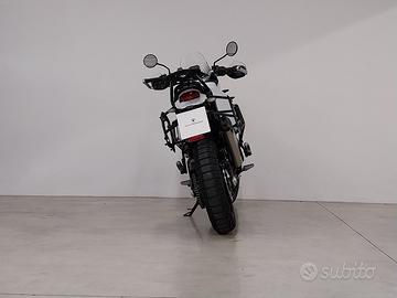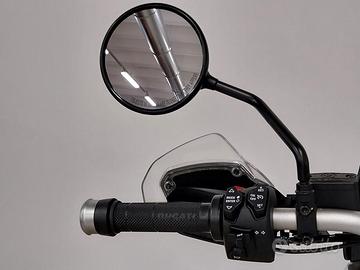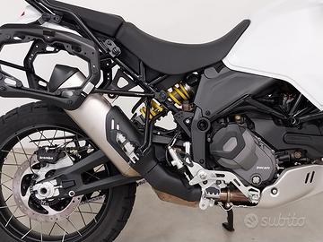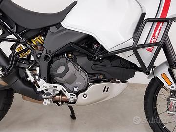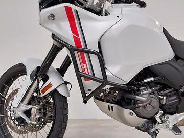 La moto monta le barre paramotore e piastra paramotore originali ducati ducati e telaietti e borse aftermarket.