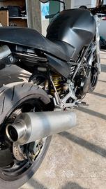 Ducati Monster 600 Dark del 1999 molto originale con 41550 km. Lo scorso anno sono state sostituite le cinghie di distribuzione, è stata effettuata una manutenzione completa e sono stati montati pneumatici posteriori nuovi. La scorsa estate ha viaggiato in Svizzera e Austria senza alcun problema. Presenta alcuni piccoli graffi e segni di usura (nessuna ammaccatura), come ci si aspetterebbe da una moto della sua età, ma è in ottime condizioni. Verrà venduta con 2 anni di revisione all'acquirente. In omaggio il manubrio originale color argento e un filtro aria K&N. Le spese di trasporto sono a carico dell'acquirente. Su richiesta possiamo fornire molte altre immagini.