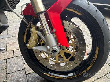 Vendo bellissima monster edizione anniversario telaio d'oro così come pinze brembo e forcelle, moto rifatta a nuovo: libretto stampato nuovo con porta libretto dedicato verniciatura con strisce e adesivi d'oro , frecce manopole e specchi sul manubrio nuovi, porta targa e scarichi in carbonio motore: catena corona e pignone, olio filtro, batteria filtro aria, candele, desmo service e tendi cinghia tutto appena fatto spurgato freni registrato frizione, sostituito varie guarnizioni, moto praticamente rifatta nuova, unica e bellissima