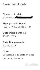 Garanzia completa Ufficiale Ducati estesa fino a maggio 2028.