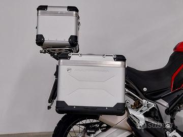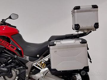 moto ben accessoriata con Terminale Termignoni in titanio, tris di valigie e bauletto in alluminio originale ducati, piastra paramotore, porta navigatore, cavalletto centrale e cupolino maggiorato.