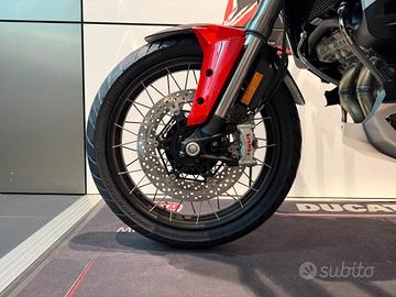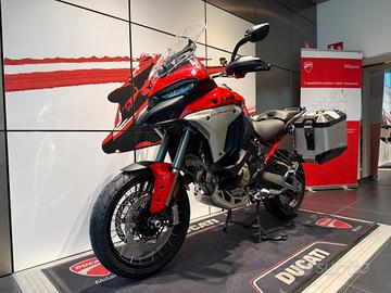 Bellissima Ducati Multistrada V4 Rally allestimentoAdventure Travel & Radar - valigie laterali alluminio, cerchi a raggi, radaranteriore e posteriore, manopole e selle riscaldate, cavalletto centrale - nellacolorazione Ducati Red.