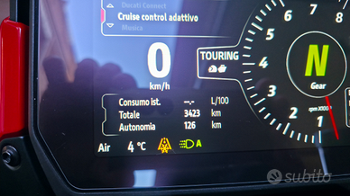Moto Perfetta.3400 km reali. , Assicurazione e garanzia Ducati fino a Aprile 2027.Ho fatto tagliandi e controlli aggiornamenti Ducati nonostante il poco tempo di utilizzarla.Moto utilizzata per 5 o 6 giri ,gomme perfette pochissimi KM,il lavoro e la Family non mi concedono tanti momenti liberi.Moto Ultra accessoriata, Valige Ducati MAI USATE,ancora in scatola,Selle riscaldate,sospesioni elettroniche, manopole riscaldate,vetro regolabile,piastra posteriore per bagaglio.radr ant e posteriore,decellera e mantiene la distanza da auto o moto anteriore, frena in caso di ostacolo ,tutto regolabile,manopole riscaldate, navigatore integrato.Full Optional