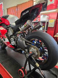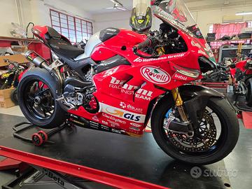 Ducati Panigale V4 R 2019 Moto campione italiano di velocità col pilota Michele Pirro, la prima Panigale V4 R che ha vinto un campionato titolato. la moto è stata conservata come utilizzato dal pilota Michele Pirro nella stagione del 19 col team Barni Racing Team. la Moto è allestita per la categoria Superbike campionato italiano velocità. gli accessori installati sono sospensioni e mono ammortizzatore mupo elettronica completa Magneti Marelli Superbike Scarico completo Akrapovic full titanio pedane racing trasmissione alleggerita.