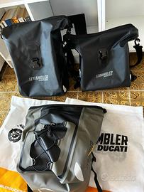 Kit completo borse originali Ducati antipioggia, composto da: Telai originali Ducati, Borse laterali Ducati, Borsa posteriore Ducati.