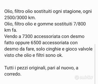 Vendo a 7300 accessoriata con desmo fatto oppure 6500 accessoriata con desmo da fare, solo cinghie e gioco valvole visto che olio e filtri sono ok.