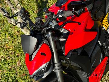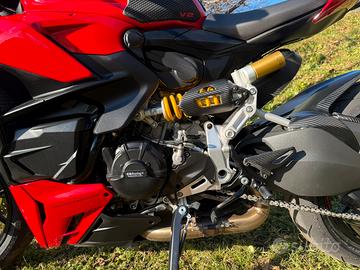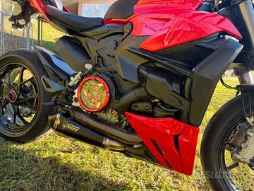 Unghia monoposto rossa, griglie protezione radiatori, paracarter replica GB Racing, telo coprimoto con logo Ducati, adesivi cerchi Vulturbike, grip serbatoio, manopole Progrip, flangia borsa serbatoio Tanklock Givi.