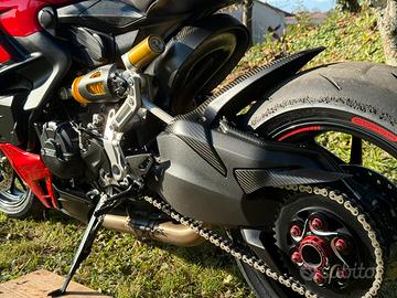 Accessori in carbonio: parafango anteriore, parafango posteriore, battitacco pedane, paracalore scarico, carter mono ammortizzatore, carter tubi olio forcellone, copertura catena superiore corona.