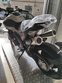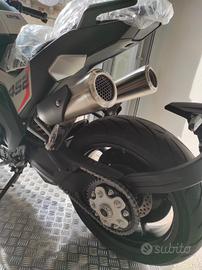Mono braccio posteriore con para cerchio , corona con parastrappi , doppio scarico in acciaio , Pirelli GT di serie , Illuminazione Full Led , alette aerodinamiche .
