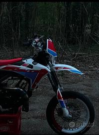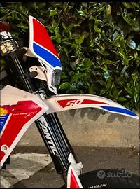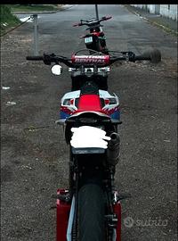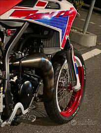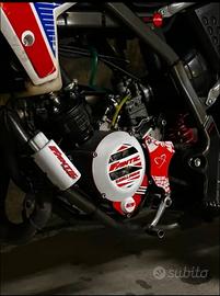 Vendo la moto per successione a cilindrata superiore Pistone: nuovo (ancora da iniziare il rodaggio) Cilindro: Lappato (ancora da iniziare il rodaggio pompa dell'acqua con 2000km frecce sul forcellone anteriore ad adesivo (frecce originali conservate) pedalina d'accensione TNT con 6000km (nera) in dotazione anche pedaline per il secondo passeggero miscelatore nuovo paracolpi renthal catena con 1000km pignone 14 con 1000km manicotto d'aspirazione con circa 1000km kit grafiche cerchio bicolor (rosso e bianco) kit personalizzato di: recupero fluidi, copri accensione, para pignone (pezzi originali conservati) in dotazione gia montato da far ancora partire il contaore Athena in dotazione ha sia una gianelli completa sbloccata e sia la pancia originale Tagliandi fatti regolarmente e utilizzando oli performanti sia del cambio che per la miscela il telaio ha 19.000 km ma il motore é revisionato come accennato prima