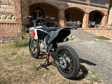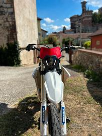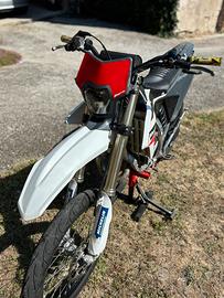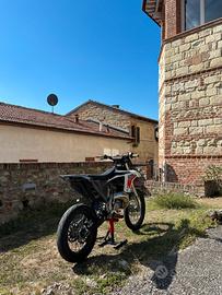 La moto monta uno scarico BUD in carbonio, paraforcelloni e gomme da strada su cerchi da enduro