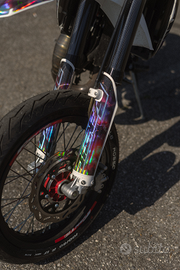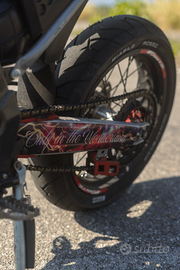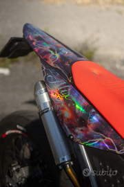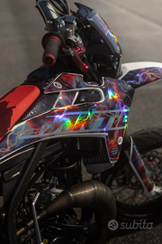 D'estetica monta manopolore nere e rosse domino , leve in ergal rosse, dettagli in carbonio finto, e grafiche 100% personalizzate da Cecchi Graphic designer. Freccie nano led presenti solo davanti
