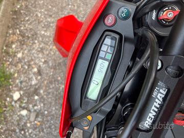 due mappe motore traction control disattivabile, mappa supermoto, frizione antisaltellamento, pinze freno brembo,sospensioni wp apex con mono con regolazioni alte e basse velocita', tutto di serie. scarico originale.