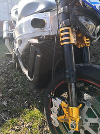 L avantreno rac 52 Marzocchi MV Augusta piastre e piedini lavorativi dal pieno pinze freno 6 pistoni IRS dischi freno pompe freno e frizione ultra regolabili IRS...manubrio renthal telaietto posteriore exnovo con sella Buell, serbatoio carbonio scarico completo leovince da rifinire