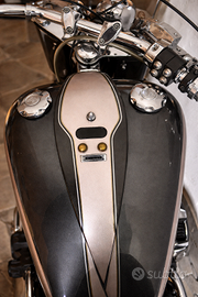 Night Train completamente trasformata, oltre 200 ore di lavorazione. Moto unica, non è la solita Harley. Scarichi con valvola apri/chiudi da manubrio, frizione Rekluse omologata a libretto, cerchi a raggi cromati, dischi margherita flottanti. Serbatoio allungato con tappi LED, sella artigianale a sbalzo, parafango posteriore integrato, manubrio dritto cromato con riser alti e faro LED stile Fat Boy. Filtro sportivo, centralina potenziata, componenti Kuryakyn, impianto frenante di livello. Verniciatura glitterata, telaio pulito con cablaggi nascosti. Gomme nuove, pronta all’uso. Moto da vetrina, ma utilizzabile tutti i giorni.