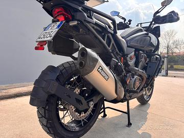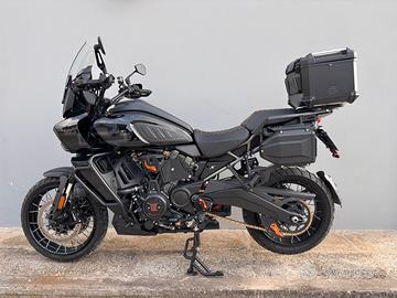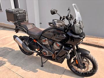 Bauletto originale Harley, frecce led, sella personalizzata, faretti anteriori aggiuntivi, griglia protezione radiatore, paramani e specchietti più belli dell’originale.