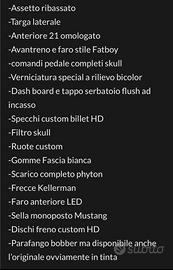 ASSETTO RIBASSATO, TARGA LATERALE, ANTERIORE 21" OMOLOGATO A LIBRETTO, AVANTRENO E FARO STILE FATBOY, COMANDI PEDALE SKULL, VERNICIATURA SPECIAL A RILIEVIO BICOLOR, DASH BOARD E TAPPO SERBATOIO FLUSH AND INCASSO, FILTRO SKULL, RUOTE CUSTOM CON FASCIA BIANCA, SCARICO COMPLETO PHYTON , FRECCE KELLERMAN, FARO ANTERIORE A LED, SELLA MONOPOSTO MUSTANG, DISCHI FRENO CUSTOM HD, PARAFANGO BOBBER MA DISPONBIBILE ANCHE L'ORIGINALE OVVIAMENTE IN TINTA.