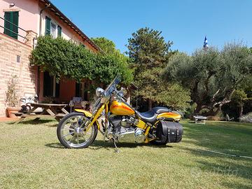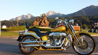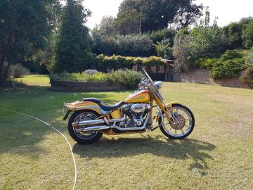 SPRINGER CVO HARLEY DAVIDSON FXSTSSE IN PERFETTE CONDIZIONI PRODOTTA NEGLI USA - SCRAMIN EAGLE ANNO 2007 cc. 1800 cv 110 COLOR ORO, ,GOMME 80 % - MARMITTE ORIGINALI CHIUSE + MARMITTE MCJ - BORSA LATERALE MCJ SGANCIO RAPIDO - DUE SELLE - CILINDRO CROMATO PORTA OGGETTI-SCHIENALINO - PORTAPACCHI - PARABREZZA SGANCIO RAPIDO -GOMMA ANTERIORE DA 21 - POSTERIORE da 200 . In Italia ne sono arrivate sole due di coloro oro nel 2007. Questa Springer CVO è stata prodotta solo nel 2007 ed è l'ultima prodotta con gomma anteriore da 21 . Moto sempre tagliandata in officina concessionario Harley Davidson. Motore in perfette condizioni, nessuna trasudazione ,mai avuto problemi , mai caduta neanche da fermo. Questa Harley ha un fascino particolare, il colore, la forcella e la ruota da 21 non più prodotta , la rendono molto molto bella. Perchè la vendo ? perchè ho 82 + 6 mesi e è diventata pesante per la mia età .