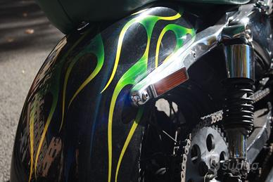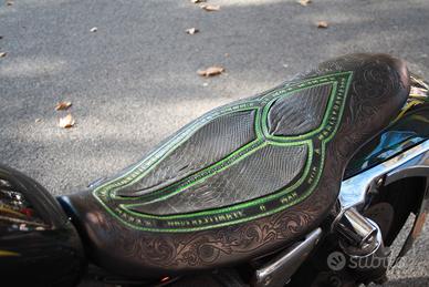 Note: La moto, interamente customizzata, presenta il serbatoio rivestito con una foglia di argento, su cui e stata realizzata l'attuale aerografia. Moto pluripremiata. Ultimo riconoscimento ricevuto all'EXPO Moto di Padova nel 2024. Disponibili 3 selle in totale, tra cui una originale monoposto, una due posti, leggermente rialzata, e la terza, realizzata in produzione artigianale dal maestro pellettista Gabriele Urzi