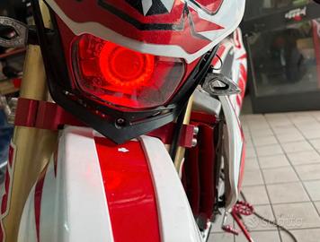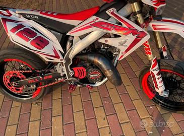 NON CEDO LO SCARICO SOLO PANCIA E TERMINALE ORIGINALE CON TERMINALE SCALVINI Vendo (valuto anche scambio) hm 125 crm per passaggio a cilindrata superiore. la moto è tenuta da amatore ed utilizzata solo per uscite domenicali. la moto monta: faro angel eye kit plastiche crf 450 kit grafiche cerchi bicolore paramani RTECH manopole progrip frecce sequenziali porta targa pieghevole carburatore 40 keihin radiatore maggiorato testa vhm kit ripotenziamento rave 2 valvola v force 3 accensione pvl 22.5 valvola lavorata filtro aria black pompa freno posteriore nissin pinza anteriore magura assieme alla moto cedo anche un tutti i pezzi originali ( terminale, pancia, kit plastiche, kit grafiche, 2 copri sella, tutti i pezzi del motore originali compreso blocchetto chiavi, volano ecc... pistone appena cambiato ha appena 5 ore biella appena cambiata compresi tutti i cuscinetti ho caricato da poco le forcelle anteriori ho cambiato tutti gli oring e guarnizioni tutte nuove appena cambiate pasticche anteriori e posteriori NO perditempo , prezzo non trattabile