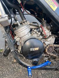 la moto monta : maxi kit tpr 86 accensione polini pacco lamellare malossi vl6 collettore aspirazione polini carburatore pwk polini 24 filtro a cono top frizione top molle rinforzate scarico completo kat race nuovo 86 forchette cambio top tpr impianto frenante anteriore 4 pompanti radiali disco maggiorato anteriore forcelle 125 da rifare impianto elettrico comprato nuovo a batteira pistone nuovo da rodare appena cambiato cilindro stock con 30 litri carter lavorati (non stuccati) prezzo trattabile