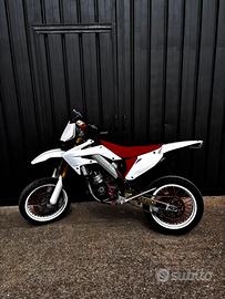 vendo hm 50, anno 2014. Buone condizioni. Motore rifatto, 5 h di vita (ho le prove del motore nuovo) quindi appena finito il rodaggio. La moto monta: -airsal 77 in alluminio con pistone mono fascia (appena sostituiti) -carburatore pwk 24 -pignone 15 denti p 428 -corona 56 denti p 428 -accensione pvl (appena anticipata) -espansione kat race calcolata per 76 -terminale dbr (appena sostituita la lana di vetro) -pacco lamellare malossi vl 18 nuovo -colletore malossi in gomma -albero e biella top spalle piene -doppio radiatore -impianto elettrico nuovo semplificato a batteria -lampadina anteriore led -pompa freno adelin -gomma anteriore 80% -gomma posteriore 100% (appena sostituita) -ci sono sia cerchi motard sia cerchi enduro insieme alla moto cedo anche molti pezzi originali tra cui anche il kit di plastiche bianche e rosse.