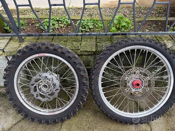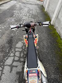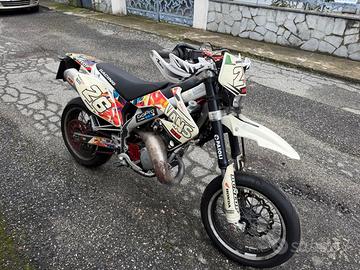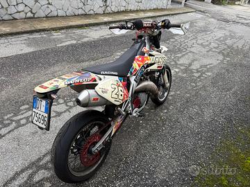 HM CRM 125 2T supermotard. La moto monta: -Kit ripotenziamento completo (valvola rave 2 e pancia a coni saldati) -Candela all’iridio -Centralina sbloccata mappature hard/soft -Carburatore KOSO PWK 30mm a valvola piatta -Pacco lamellare in carbonio V-Force 3 -Radiatore raddoppiato con eliminazione miscelatore -Gomme Continental Contiattack SM praticamente nuove -Paramani Racetech -Manopole domino -Corona in ergal rosso -Catena rossa -Grafiche originali Effetti Racing Il motore è stato rettificato a circa 10000 km Regalo insieme alla moto varie parti di ricambio e pezzi originali, inoltre ho disponibili per la vendita a 200€ una coppia di cerchi enduro Takasago Excel da revisionare e compatibili con la moto.