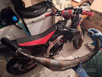 La moto monta gruppo termico airsal 70cc in alluminio con circa 500 km( montato a luglio),carburatore 21 dell'orto,pacco lamellare vl18, filtro aperto polini, scarico stage 6 calcolato, albero top 39 e frizione malossi rinforzata.