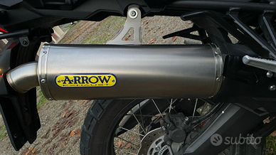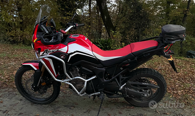 Honda Africa Twin fine 2019, cambio manuale, tricolor rosso bianco e nero. Scarico completo Arrow (dotazione anche originale). Monta cavalletto centrale e barre paramotore alte.