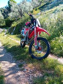 Come da titolo vendo honda crf 450r 2014 targata con 150 ore ,doppia omologazione per montaggio cerchi motard,omologata per 2 persone,forcelle anteriori e mono revisionati con 2 ore,scarico termignoni con collettori in titanio,radiatori e pompa acqua maggiorati,dischi e pasticche appena montate,catena corona e pignone con tendi catena,ancora nuove cerchi e mozzi faba,piastre forcella in ergal (geco),impianto elettrico funzionante,accensione a pedale..