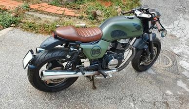 Vendo per inutilizzo, come da titolo, honda cb 400 anno 1984 trasformata in cafe racer ma senza modificare il telaio quindi può essere riportata anche alla versione originale. Sostituito avantreno e retrotreno con Honda Cbr, sella cafe racer, freni a disco anteriore e posteriore,ammortizzatori a gas, sostituite manopole e specchietti. Completamente riverniciata con pellicola opaca con aggiunta di adesivi.Vendo anche i pezzi originali. La moto è già iscritta ASI con possibilità di assicurazione 150 euro ed è esente dal pagamento del bollo. Massima serietà. Visibile zona avellino. scambio con vespa a px150 o px 200 con eventuale conguaglio.