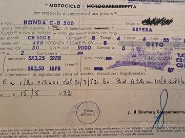 Vendo Honda CB 500 Four K0 del 1972 conservata in ottime condizioni generali. Moto d'epoca, targa originale, iscritta FMI, esente da bollo e con assicurazione ridotta. Gomme nuove, originale in tutti i dettagli eccetto kit accensione elettronica e marmitte Busso, revisione effettuata 05/24 e valida sino al 05/2026. Compresi nell'acquisto accessori originali dell'epoca: paramotore (visibile in foto), portapacchi e paraspruzzi parafango posteriore (non visibile in foto) e piatto accensione puntine/condensatori originale. Gradito primo contatto via mail, solo se veramente interessati.