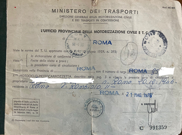 Targa Roma e documenti originali di prima immatricolazione. Restauro totale, motore perfetto scarichi nuovi originali. Carburatori allineati e batteria al gel nuova. Monta doppio disco e pompa maggiorata (frenata eccellente) ma viene ceduta a corredo la pompa originale.