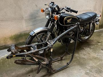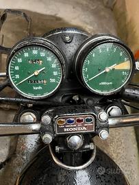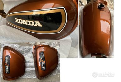 Honda CB 500 K2 completa come da foto. Lecita provenienza, la moto viene dall’Olanda + fornisco telaio con targa italiano, radiato d’ufficio (targa VI 1115xx – CB500 2091xxx) per rimetterla su strada. Il telaio è ancora originale, da riverniciare. Funzionante, chiavi originali (una copia), accensione elettronica tipo “New Tronic”, scarico Marving 4 in 1, cromature ottime, nel complesso ben conservata. Fornisco un serbatoio e fianchetti già restaurati e con trattamento interno colore “Candy Garnet Brown”, set scarichi Busso, bandiere faro K2 (introvabili), cavalletto centrale e paraspruzzi posteriore. Per completarla mancano gli specchietti, il tappo del serbatoio, il maniglione posteriore (come per le bandiere faro, al momento monta quello del K3) e i supporti frecce posteriori. Vendo per mancanza di tempo e cambio progetto. Disponibile per informazioni, no perditempo, il prezzo non è trattabile (per chi sa, solo per il serbatoio e fianchetti non sono sufficienti 1k euro…). Dispongo di molti pezzi per questa moto. Il serbatoio nero NON è incluso. Appena possibile aggiungerò qualche foto migliore.