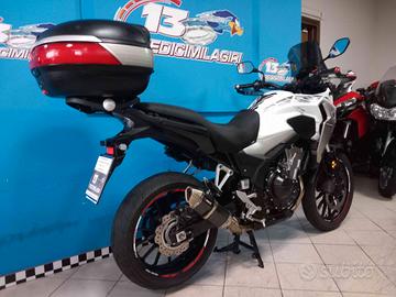 Accessori/note: BELLISSIMA HONDA CB500X. 35KW. IDONEA ANCHE PER PATENTE A2. COMPLETAMENTE ORIGINALE IN UNA STUPENDA COLORAZIONE BIANCO METALLIZZATO CON LIVREA DEDICATA. TAGLIANDI CERTIFICATI E KIT TRASMISSIONE NUOVO. VERSIONE ABS, COMPUTER DI BORDO , ILLUMINAZIONE FULL LED. MONTA CUPOLINO MAGGIORATO, CAVALLETTO CENTRALE E LATERALE, KIT PARAMANI, BAULETTO POSTERIORE CON PIASTRA E PORTAPACCHI DEDICATO A SGANCIO RAPIDO, SCARICO SPORTIVO CON DBKILLER ESTRAIBILE. DISPONIBILE LO SCARICO ORIGINALE E SET DI TELAIETTI GIVI A SGANCIO RAPIDO PER LE BORSE LATERALI.