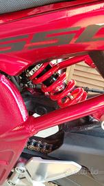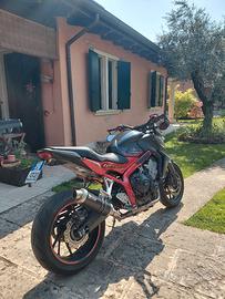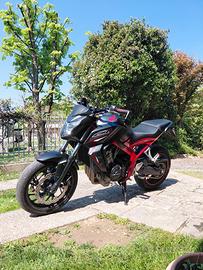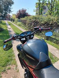 Vendo cb 650 f depotenziata a libretto per A2. Dispongo di due centraline, una a potenza piena (attualmente montata) e una depotenziata a 35kw. Ogni centralina ha la sua coppia di chiavi. La moto monta uno scarico completo Mivv omologato, con db killer estraibile (€800) Dispongo dello scarico originale. Monta inoltre un mono ammortizzatore YSS (€500). Dispongo del mono originale. Inoltre è stato installato un manubrio rialzato Gilles a diametro variabile. Le leve sono avdb moto, colore titanio. Manopole Domino, specchietti bassi omologati. Sono presenti numerevoli modifiche estetiche come copri carter, tappo olio freni, para graffi per imbocco serbatoio ecc... Gommata Metzeler M5, posteriore cambiato da poco, anteriore a poco meno di metà vita. Assieme alla moto cedo una marea di pezzi originali e non, come grip serbatoio, un'altro set di leve, tamponi ecc. Puttroppo a causa di un'uscita di strada la plastica dx e il terminale moto hanno qualche graffio, principalmente causati da rami d'albero. Per quanto riguarda la manutenzione la moto è stata tagliandata 5k km fà, revisione forcella anteriore fatta a gennaio di quest'anno. Il mono è stato montato qualche mese fà nuovo. La moto ha un sound da paura, non mancano scoppietii in scalata, anche con db killer inserito. È una moto abbastanza facile da guidare, non ha una posizione estrema e permette sia di godersi giri in tranquillità sia di andare veramente forte nei passi. È caratterizzata da una coppia elevata anche a bassi regimi, nonostante sia un 4 cilindri. A causa dei graffi sulla parte destra sono disposto a trattare leggermente il prezzo. Rimango a disposizione per eventuali foto/video o chiarimenti.
