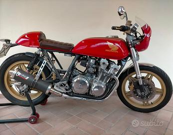 Honda CB750F customizzata stile Cafè Racer, forcella anteriore rovesciata provenienza Ducati Monster, dischi freno, pinze, pompe Brembo, revisione generale meccanica, carburatori revisionati con ricambi originali, nuova strumentazione, sella con codino anni '70, cupolino, silenziatori Mivv omologati, ammortizzatori post. YSS, efficientissima, usata molto poco, dopo la revisione percorsi km 2000, iscritta all'Asi (Targa Oro), il cliente vende a malincuore per scarso utilizzo. Moto in conto vendita. Per ulteriori info: - Luca ore negozio