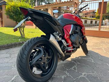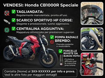 Splendido esemplare di Honda CB1000R dell'anno 2010, con 40.000 km all'attivo. La moto è stata curata maniacalmente e presenta una serie di migliorie tecniche che ne elevano drasticamente le prestazioni e il piacere di guida rispetto al modello originale. CARATTERISTICHE PRINCIPALI: • Meccanica: Regolarmente tagliandata, pronta all'uso. • Ciclistica: Forcelle anteriori completamente riviste e preparate da Burani Moto per la massima precisione in inserimento. • Freni: Upgrade con Pompa Radiale Brembo per una frenata potente e modulabile; pastiglie e dischi in ottimo stato (Freni OK). • Pneumatici: Gomme in ottimo stato, non necessitano di sostituzione a breve. ACCESSORI E MODIFICHE: • Scarico Sportivo HP Corse: Design unico e sound coinvolgente. • Centralina Aggiuntiva: Mappatura ottimizzata per un'erogazione più piena e fluida. • Kit Barracuda: La moto è impreziosita da accessori Barracuda Design, inclusi paratelaio e altri dettagli estetici. • Portatarga sportivo: Per un look posteriore più snello e aggressivo.