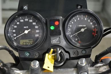 DEK:[10533605] OTTIME CONDIZIONI COMPLETAMENTE ORIGINALE ---- SOLO 29.000 KM !! ---- Motore: quattro cilindri in linea trasversale da 599 cc, raffreddato a liquido, 4 valvole per cilindro, distribuzione DOHC (doppio albero a camme in testa), alimentazione a iniezione elettronica PGM-FI con corpi farfallati da 34 mm. Potenza: circa 78 CV (57 kW) a 10.500 giri/min. Coppia: circa 59 Nm a 8.250 giri/min. Trasmissione: cambio a 6 marce, trasmissione finale a catena.Telaio e ciclistica: telaio in alluminio pressofuso tipo mono-backbone (derivato dalla CBF1000), forcella anteriore telescopica Ø 41 mm (escursione 120 mm, non regolabile), monoammortizzatore posteriore con leveraggio Pro-Link regolabile nel precarico (escursione 125 mm); cerchio anteriore da 17'' con pneumatico 120/70-ZR17, cerchio posteriore da 17'' con pneumatico 160/60-ZR17; impianto frenante con doppio disco anteriore Ø 296 mm (pinze a doppio pistoncino) e disco posteriore Ø 240 mm (pinza singolo pistoncino); sistema ABS di serie o opzionale a seconda della versione.Altezza sella: regolabile su tre livelli: circa 770 mm / 785 mm / 800 mm. Peso: circa 222 kg in ordine di marcia (versione con ABS). Serbatoio: capacità circa 20 litri ([?] 5,3 US gal).Stile: roadster o semicarenata (versione CBF600N nuda, CBF600S semicarenata con cupolino regolabile); design sobrio e funzionale, linee fluide e impostazione turistica ma moderna. Carattere: moto equilibrata e versatile, pensata per adattarsi a piloti di ogni livello. Offre comfort, affidabilità e prestazioni brillanti ma gestibili, con una ciclistica stabile e prevedibile. Ideale per uso quotidiano, turismo e guida rilassata, con il classico comportamento fluido e progressivo dei quattro cilindri Honda.La motocicletta viene consegnata con TAGLIANDO e REVISIONE in ordine, GARANZIA DI 12 MESI con DICHIARAZIONE DI CONFORMITA' a norma di legge. VALUTIAMO IL RITIRO IN