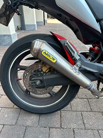 Vendo honda cbr 600 F ABS La moto è in ottime condizioni, giusto qualche graffietto causati da sassolini mentre la usavo. Sempre parcheggiata in box. Attualmente non in uso per mancanza di tempo e usata pochissimo negli ultimi anni. Moto mai usata in pista e mai incidentata. - ultimo tagliando eseguito il 20/5/2024 - revisione scade a maggio 2026 Accessori montati: - gomme diablo rosso IV montate il 20 maggio 2024 e fatti pochissimi km - scarico arrow pro race exhaust con certificato di omologazione - cupolino nero - mappatura centralina - filtro aria - faro xeno - frecce anteriori e posteriori slim - specchietti ridotti - manopole - contamarce - copri sella posteriore bianco Vendo solo per mancanza di tempo e mi spiace tenerla in box. Moto pronta da usare, non necessita di alcun lavoro!