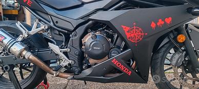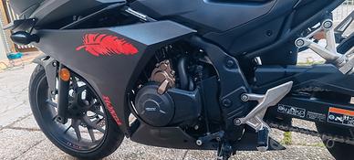 Cbr500 2017 con 27.500km in perfette condizioni Caratteristiche principali: -Tagliandi regolari -Gomme al 70% -Revisione valida fino 05/2027 -Colore nero metallizzato, personalizzato con sticker (quindi removibili facilmente se non piacciono) Fatto revisione delle forcelle e spurgo freni completo 1000km fa Tenuta sempre al coperto Monta i seguenti accessori: -Terminale Dominator -Alette aerodinamiche per un look più accattivante -Copertura per motore e carter per proteggerlo da eventuali cadute -specchietti aftermarket -Monoposto removibile Disponibile report Carvertical su richiesta Per qualsiasi altra informazione o per vederla dal vivo contattatemi tranquillamente Possibilità di trasporto sul territorio italiano previo anticipo delle spese di trasporto e caparra.