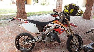 Vendo splendida Honda CR 125 2 Tempi del 2006, allestita Motard e regolarmente omologata per l'uso stradale. ideale per patente A1 (16 anni) e appassionati. Tenuta in modo maniacale e pronta all'uso. Kit grafiche complete Repsol HRC. Cerchi motard con gomme Bridgestone Battlax. Disco anteriore maggiorato (Yutaka) e forcelle Kayaba. Manubrio Renthal a piega alta, paramani Acerbis rossi, portatarga sportivo. Cedo insieme alla moto alcuni pezzi di ricambio e un secondo kit di carene/plastiche completo (versione precedente), utile per uso pista o come scorta. Per info o per visionarla dal vivo, contattatemi in chat. No perditempo, valuto offerte sensate.