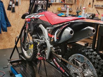 Officina specializzata nell offroad vende Honda CRF 250 R anno 2018 competizione ufficiale red moto con manuale e cavalletto originale. Moto con 46 ore totali da nuova ma ZERO da quando è ststa completamente rifatta. Moto portata a telaio nella mia officina e completamente rifatta da capo. Tutti i lavori sono dimostrabili al 100%. Motore nuovo di biella, pistone alta compressione, cuscinetti, distribuzione, valvole e terza marcia del cambio. Testa lavorata con sedi in bronzo berillio e valvole maggiorate, condotti maggiorati e flussati da martin racing, un missile. Gira con una cattiveria inaudita. Tutta la minuteria, viti, perni motore e scorrimento di tutta la ciclistica nuovi. Pedane in ergal con supporti nuovi, perni, molle. Non ha un grammo di sporco. Tutte le viti delle plastiche, delle piastre e delle ruote nuove. Graficata nuova. Forcelle e mono rifatti di olio e tenute. Cerchi orginali ancora nuovi perchè era usata con altri cerchi. Gomme sono nuove, pastiglie e dischi nuovi. Cuscinetti del leveraggio e del telaio fatti. Tutti i liquidi. Pronta per la pista. Nella foto non si vede ma c'è anche il paramotore nuovo della acebis nero. Moto ottima per chi vuole una moto prontissima fin da subito.
