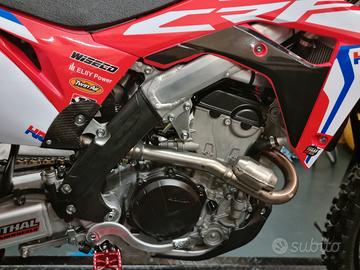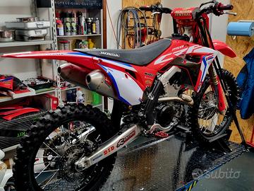 Honda CRF 250 R anno 2020 competizione cross con documento. Moto portata a telaio nella mia officina e completamente rifatta da capo. Tutti i lavori sono dimostrabili al 100%. Motore nuovo di biella, pistone alta compressione, cuscinetti, distribuzione, valvole e terza marcia del cambio. Tutta la minuteria, viti, perni motore e scorrimento di tutta la ciclistica nuovi. Pedane in ergal con supporti nuovi, perni, molle. Non ha un grammo di sporco. Graficata nuova. Forcelle e mono rifatti. Cerchi orginali ancora nuovi perchè era usata con altri cerchi. Piastre in ergal! Gomme sono seminuove, pastiglie e perni delle pinze nuovi. Cuscinetti del leveraggio e del telaio fatti. Tutti i liquidi. Pronta per la pista.