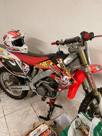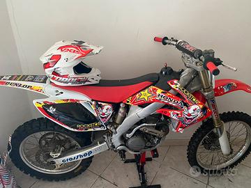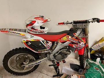 Honda crf 250 con motore rifatto e mai utilizzato. Lavori eseguiti da meccanico specializzato.Ha bisogno di un tagliando perché fermo da anni. Compreso del prezzo regalo anche cavalletto moto, pedaline rosse ancora da montare, casco, occhiali guanti, pettornina para colpi e diverse tute ancora tutto nuovo con cartellino e mai indossato e con scato di acquisto. Il prezzo non è trattabile. Contattare se interessati e per qualsiasi altra informazione.