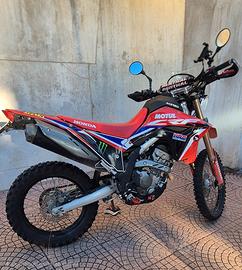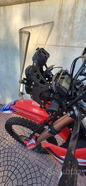 Mono Gubellini, Torretta in carbonio 4K, Manubrio Renthal 993, Serbatoio maggiorato Aceris, Paramani in acciaio Acerbis, pedane maggiorate, specchietti pieghevoli.